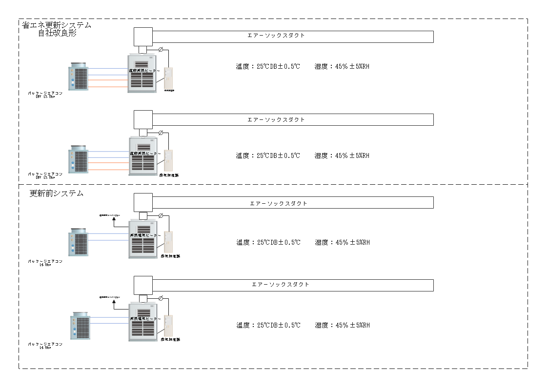 弊社独自の改良型省エネルギー形パッケージエアコンを導入していただき今までの消費電力を低減させ、かつ温度・湿度の環境条件を独自の制御方法及び省エネ空調機による消費電力の低減をいたしました。